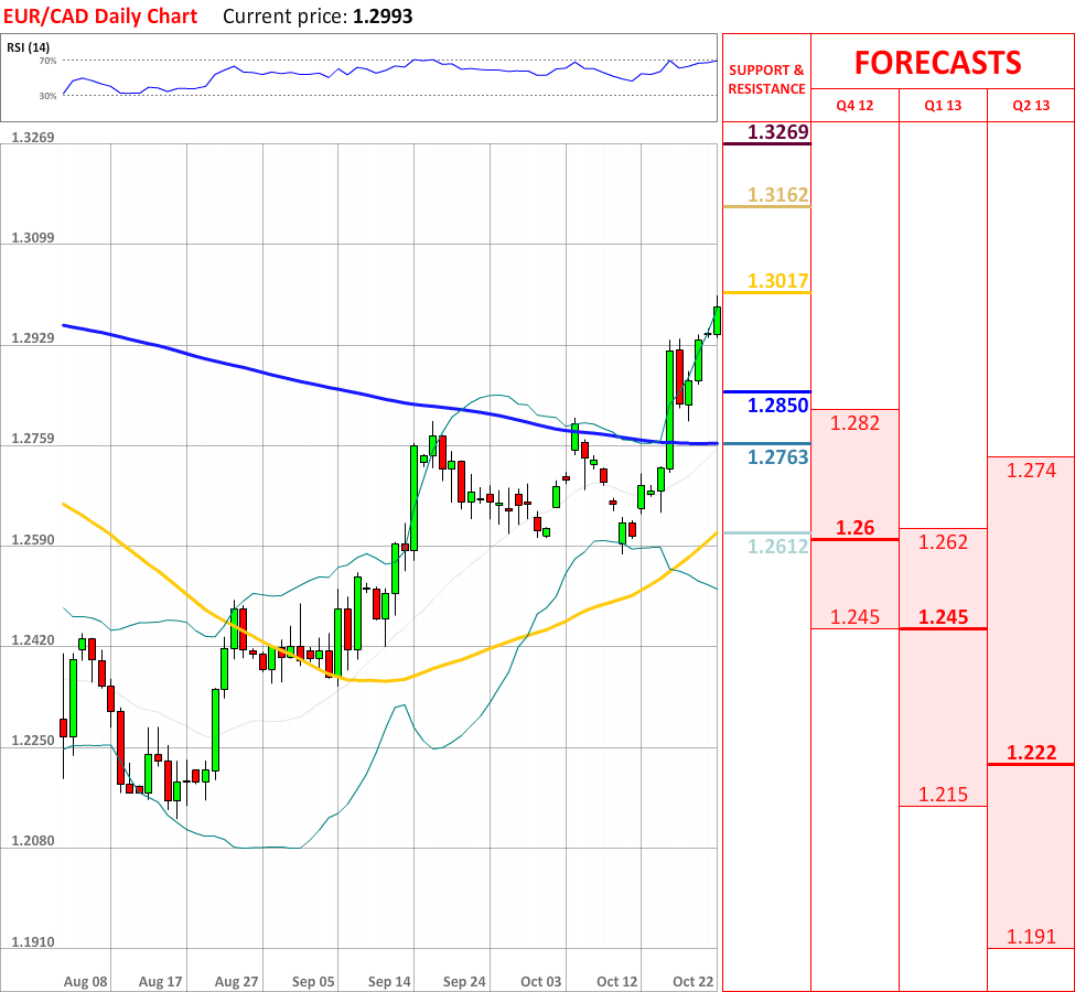 OutlookThe interim uptrend, which started more than a week ago, successfully managed to advance further, as today the EUR/CAD currency pair experienced another bullish advance. At the particular moment the currency couple confronts the upper Bollinger band at 1.3017, which is expected to reverse the direction of the current movement. However, if it fails to slow down the rally, then the price might reach the weekly R2 at 1.3162, which is very likely to stop the prevailing trend. Nevertheless, the overall indicator outlook is neutral, therefore no significant trend reversals are expected in the nearest future.