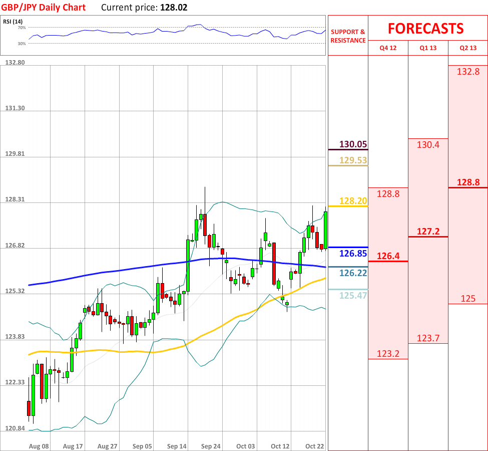 OutlookToday GBP/JPY experienced a significant bullish correction, which has already managed to breach the weekly PP at 126.85, and at the particular moment the currency pair is facing the upper Bollinger band at 128.20, which is expected to slow down the uptrend. In case it is broken, then the currency couple is likely to reach the weekly R2 at 129.53, which in turn might bring some bearish impetus. In addition, the overall indicator outlook is bullish, therefore supporting the prevailing tendency.