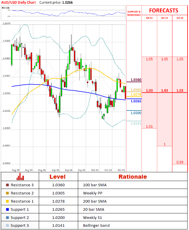 Pair tried to step up at the beginning of the week, but did not manage to advance far above 1.03 and currently is trading at 1.0265. For the moment it is stuck between 20 bar and 200 bar SMA, but bearish momentum is likely to depress pair to 1.02.