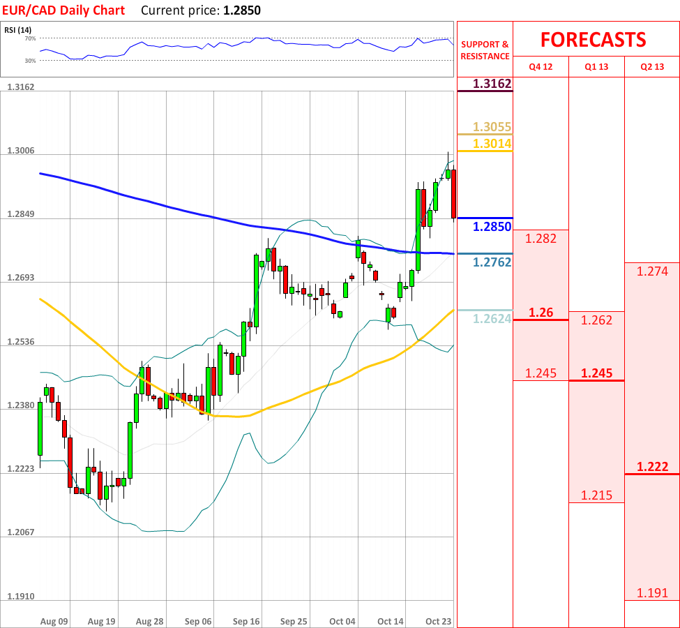 OutlookThe interim bullish tendency, which started more than a week ago, has failed to continue, as today EUR/CAD experienced a significant bearish decline. At the particular moment the currency pair confront the weekly PP at 1.2850, which might slow down the downtrend, however, if it is broken, then the price will probably reach the 200-day SMA at 1.2762, which in turn is very likely to stop the current movement downwards. In addition, RSI indicator still shows a neutral signal, as well as the overall indicator outlook has changed from positive to neutral.
