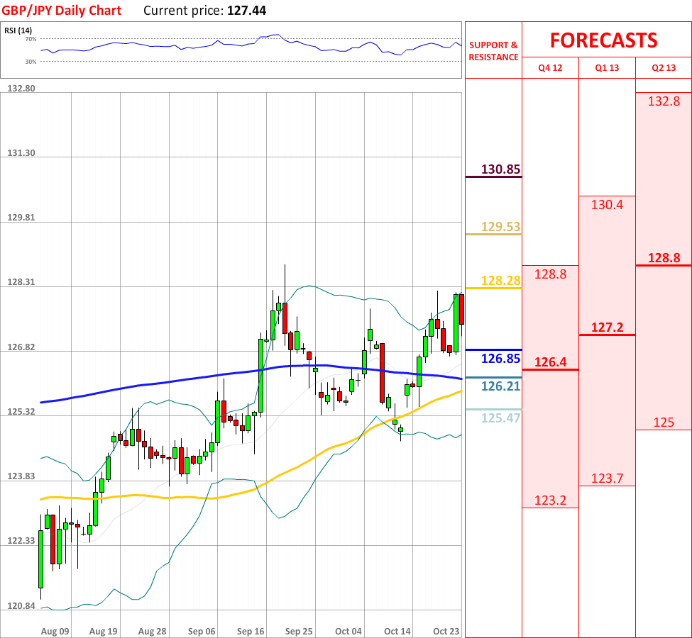 OutlookYesterday's bullish advance has failed to continue, as the GBP/JPY currency couple rebounded from the upper Bollinger band, and at the particular moment the currency pair is heading towards the weekly PP at 126.85, which might bring some bullish impetus. If it is breached, then the price might reach the 200-day SMA at 126.21, which will probably change the direction of the prevailing tendency. Additionally, RSI indicator still shows a neutral signal,as well as the overall indicator outlook remains neutral.