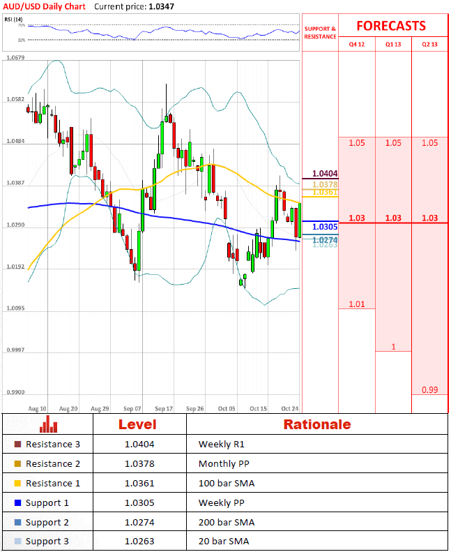 After plummeting by 70 pips yesterday, pair has recovered exactly the same amount today and is hovering slightly above yesterdays opening level at 1.0347. Gap between closest support and resistance levels leaves a lot of space for maneuvering. Combined together with neutral market sentiment it lets us to believe that pair might be range bound for some time.