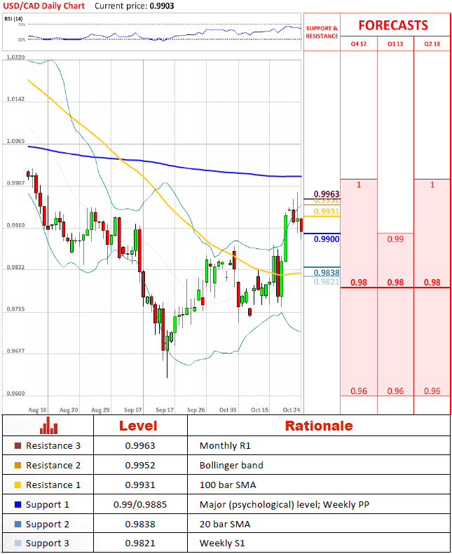 After few rather volatile days pair seems to be showing clear directional signals and earlier in the session today attempted to fall below 0.9985. Although weekly pivot (PP) did not surrender at first it is likely pair will attempt once more tomorrow after what we should see a dip to 0.9838.