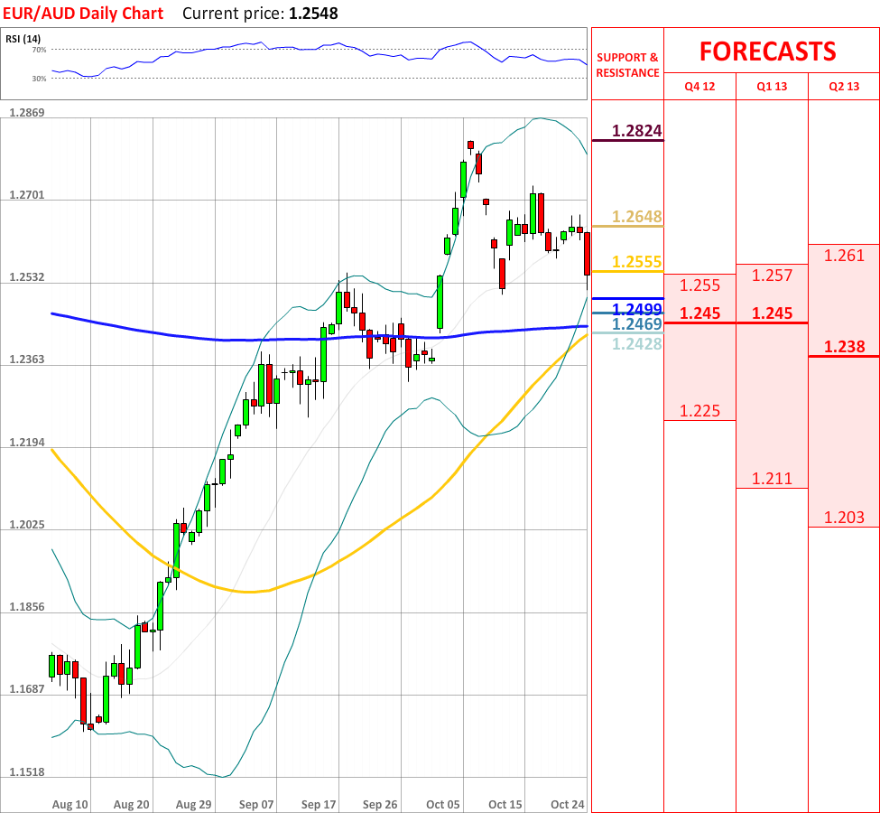 OutlookThe bearish tendency, which started yesterday, successfully managed to continue, and today the EUR/AUD currency pair experienced a significant bearish reaction. At the particular moment the currency couple is about to test the lower Bollinger band at 1.2499, which is expected to stop the current movement downwards. In case it is breached, then the price will probably reach the weekly S2 at 1.2469, which in turn might bring some bullish impulse. Moreover, the overall indicator outlook is bearish, therefore supporting the prevailing bearish trend.