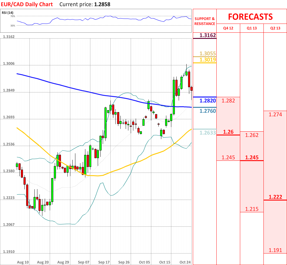 OutlookThe bullish trend, which started yesterday, managed to continue, as today the EUR/CAD currency couple another bearish reaction, which has already managed to break the weekly PP. As for now the price is heading towards the monthly R1 at 1.2820, which might bring some bullish impetus. If it is breached, then the currency pair is very likely to reach the 200-day SMA at 1.2760, which in turn is expected to change the direction of the current tendency. Nevertheless, the overall indicator outlook has changed to positive, therefore a soon trend reversal might be expected.