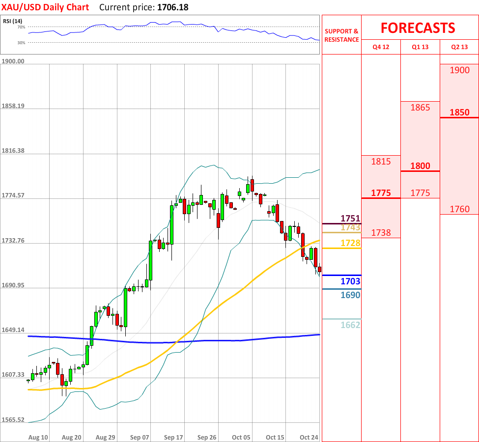 OutlookToday the XAU/USD exchange rate experienced another consequent bearish decline, therefore supporting the interim bearish trend. As for now, the exchange rate is about to test the lower Bollinger band at 1703, which is expected to change the direction of the prevailing downtrend. In case it is broken, then the price might reach the weekly S1 at 1690, which in turn will probably bring some bullish impulse. Additionally, the overall indicator outlook is still negative, therefore supporting the bearish tendency.