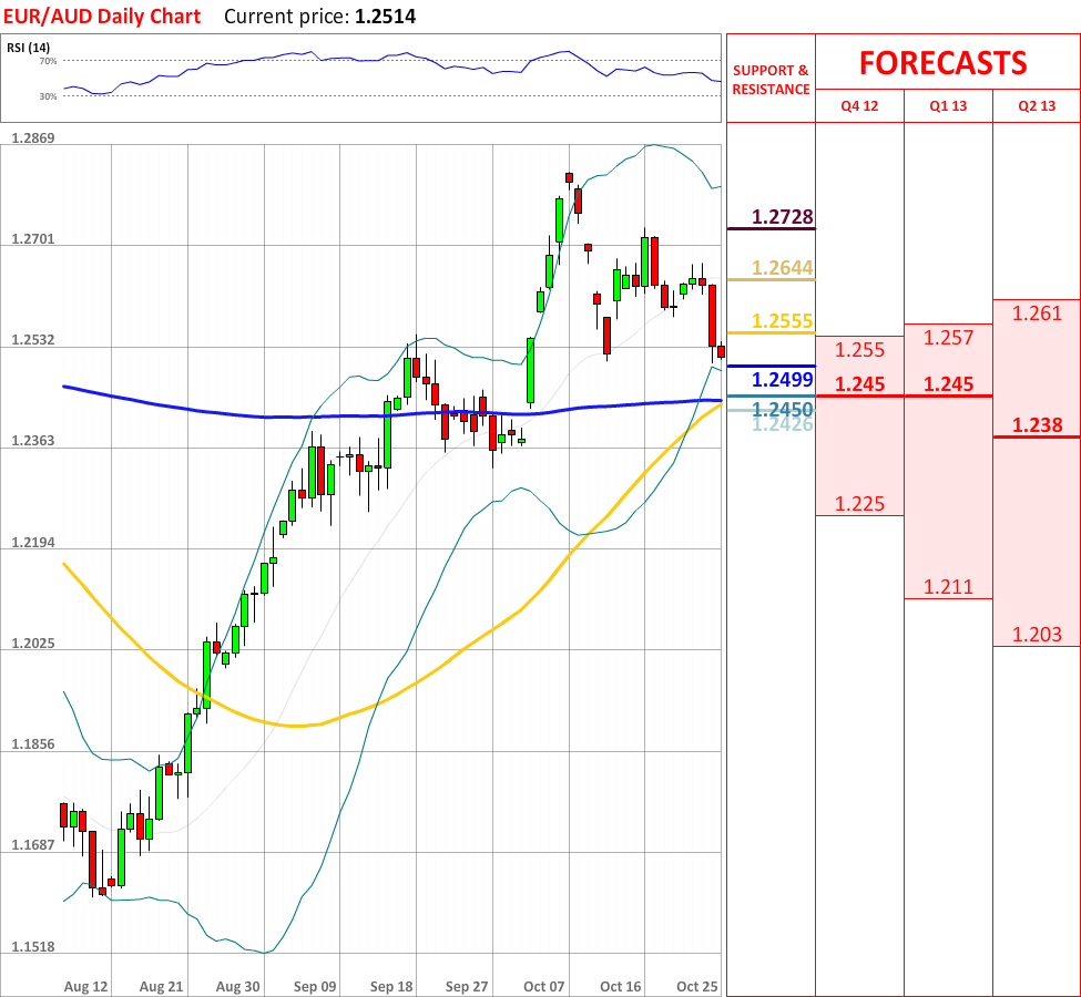 OutlookThe bearish trend, which started a couple of days ago, has successfully managed to continue, as today the EUR/AUD currency pair experienced another slight movement downwards. At the particular moment the currency couple confronts the lower Bollinger band at 1.2499, which is expected to reverse the prevailing bearish tendency. In case it is breached, then the price might reach the 200-day SMA at 1.2450, which in turn will probably stop the current downtrend. Nevertheless, the overall indicator outlook has changed to neutral, therefore no significant trend reversals are expected in the nearest future.
