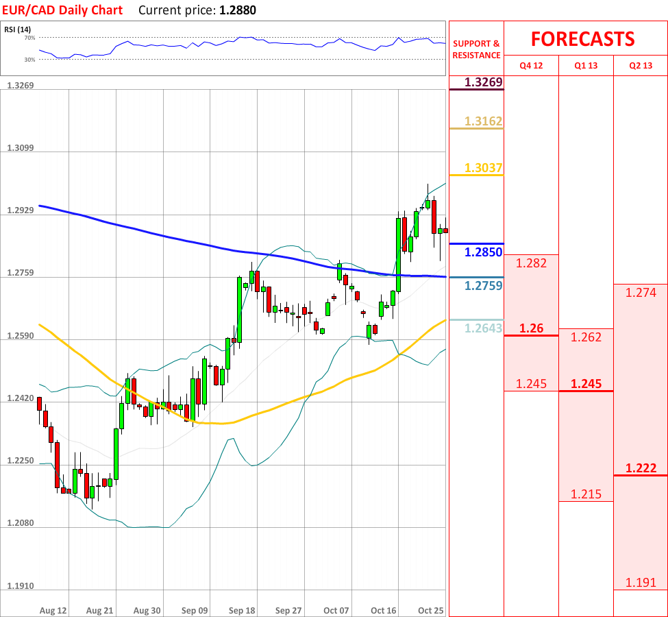 OutlookThe bullish correction, which occurred yesterday, did not manage to continue, as today the EUR/CAD currency couple experienced a slight bearish reaction, and at the particular moment the price is gradually heading towards the weekly PP at 1.2850, which might bring some bullish impulse. In case it fails to stop the downtrend, then the currency pair is likely to reach the 200-day SMA at 1.2759, which in turn is expected to change the direction of the current tendency. In addition, the overall indicator outlook remains positive, therefore supporting the potential trend change in the nearest future.