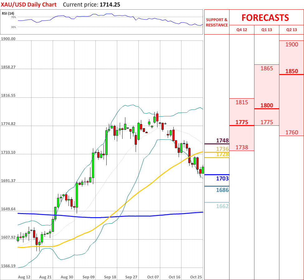 OutlookToday the XAU/USD exchange rate experienced a slight bullish correction, which managed to stop the interim downtrend. As for now, the exchange rate is slowly approaching the weekly PP at 1728, which might bring some bearish impetus. In case it fails to slow down the rally, then the price is very likely to reach the 55-day SMA at 1736, which in turn will probably stop the prevailing movement upwards. Moreover, the overall indicator outlook is neutral, and it is not expected to change in the nearest future.