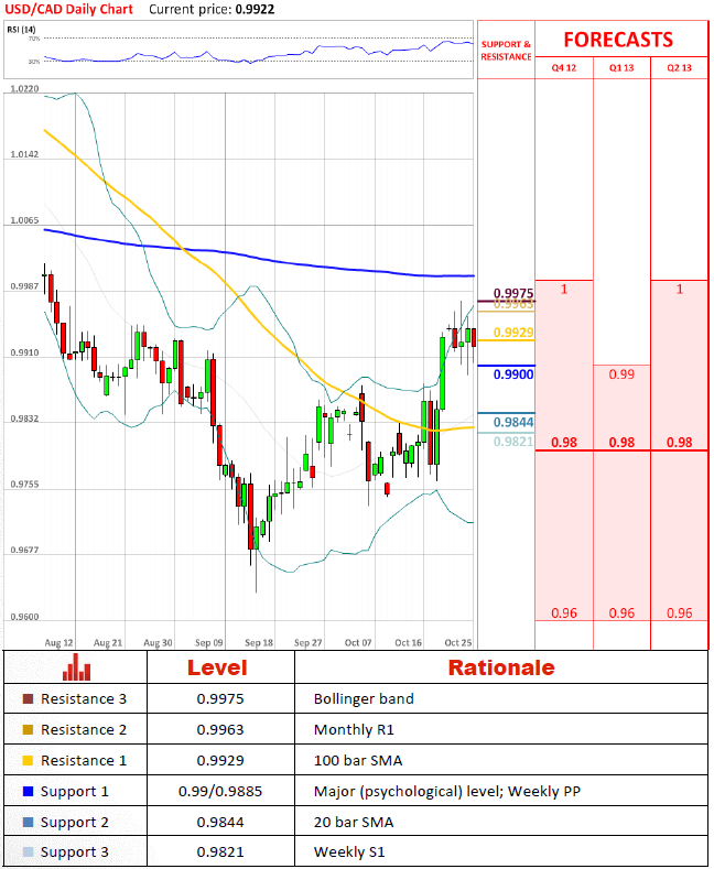 For the whole week pair has been rather volatile (boundaries Bollinger bands increased by 1/3, or 63 pips) but pair has been range bound between monthly pivot (R1) at 0.9963 at 0.99. It is likely situation wont change much till the end of the trading week, but technical indicators on weekly horizon lets us believe that 100 bar SMA might drag pair lower in the period of next few weeks.