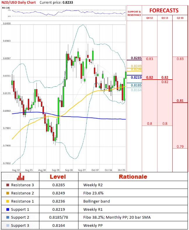 After receiving a bearish impetus from Bollinger band/100 bar SMA at 0.8110 pair has advanced a bit more than 120 pips in past few days. With such pace pair is rapidly approaching oversold condition (if it is not there yet) and, as technical indicators points out, we should see at least a bearish correction in the near future.