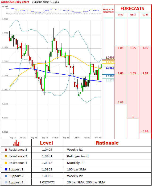 Pair is ferociously trying to advance above 1.04, however,  monthly pivot (PP) does not allow it to do so and every time pair returns to 100 bar SMA for the time being. New week should not be much of a different—pair should continue appreciating by 10-20 pips in a session. Situation should become completely different once pair breaches monthly pivot (PP).