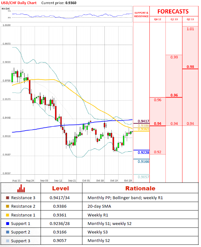 USD/CHF pair continues to appreciate with a target at 0.9380/0.94 area, where a lot of resistance levels go. Last Thursday the price was already pulled back from this zone with a peak at 0.9387. But to prepare for a proper price settlement in this zone, it has to reach this level and close a D1 candle around this area, what would indicate about possible changes in trend.