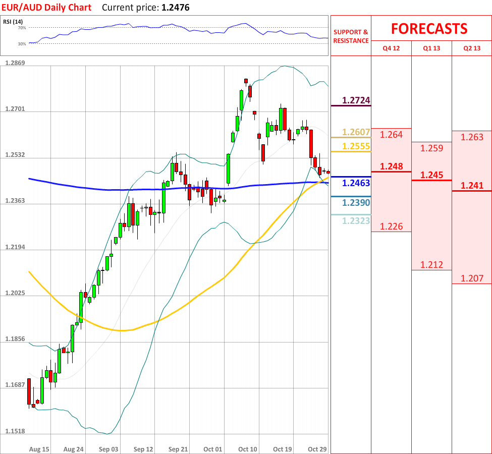 The interim bearish tendency, which started more than a week ago, successfully managed to continue, as today the EUR/AUD currency pair experienced another consequent movement downwards, and at the particular moment the currency couple is about to test the 55-day SMA at 1.2463, which is likely to bring some bullish impulse. In case it is breached, then the price might reach the lower Bollinger band at 1.2390, which in turn is expected to reverse the prevailing downtrend. Moreover, the overall indicator outlook is neutral, therefore no significant trend reversals are expected in the nearest future.