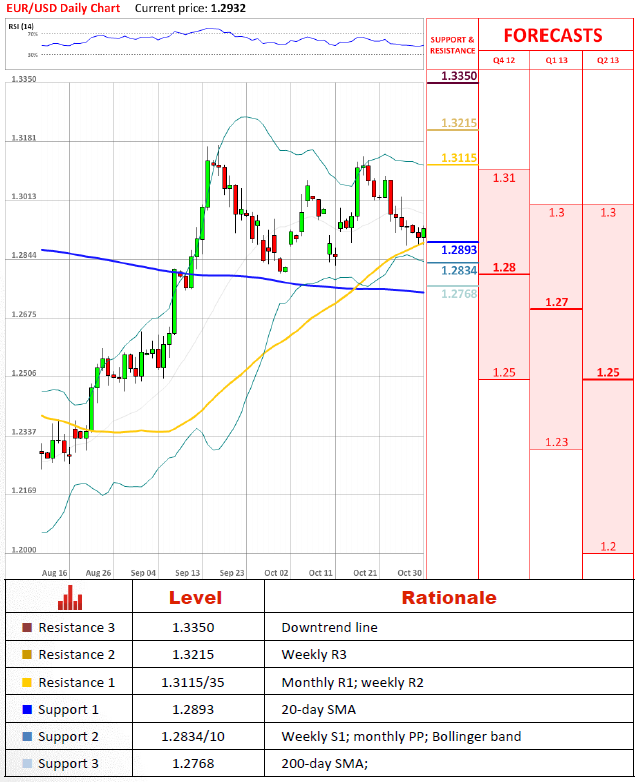 EUR/USD pair continues to move south and has already reached the 55-day SMA at 1.2893. This level is the only one, which might accumulate some support for a pair's current depreciation, therefore it is very possible that the exchange rate will extend it decrease till the Bollinger band at 1.2827 or even till 1.2762, where the weekly S2 and the 200-day SMA are situated.
