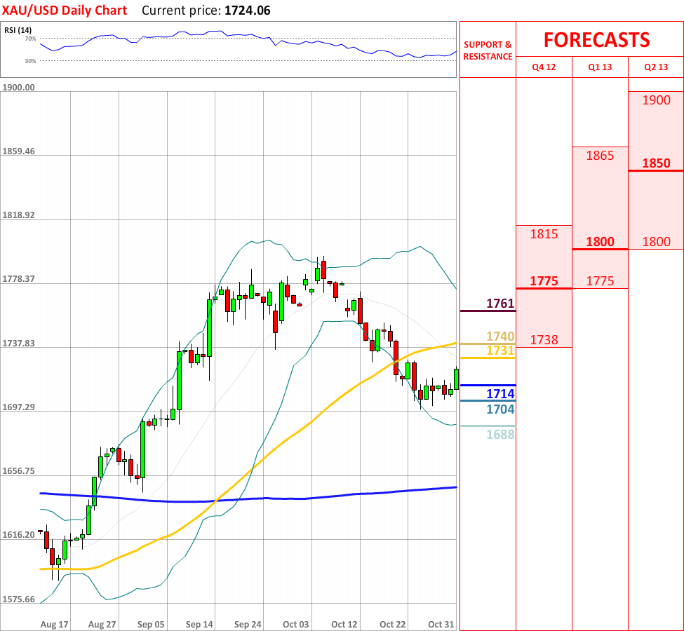 OutlookThe bullish correction, which started yesterday, successfully managed to continue, as today the XAU/USD exchange rate experienced another bullish advance. As for now, the price is heading towards the 20-day SMA at 1731, which might slow down the current rally. In case it is breached, the the exchange rate will probably reach the 55-day SMA at 1740, which in turn is very likely to bring some bearish momentum. Additionally, RSI indicator still shows a neutral signal, although the overall indicator outlook remains bearish.
