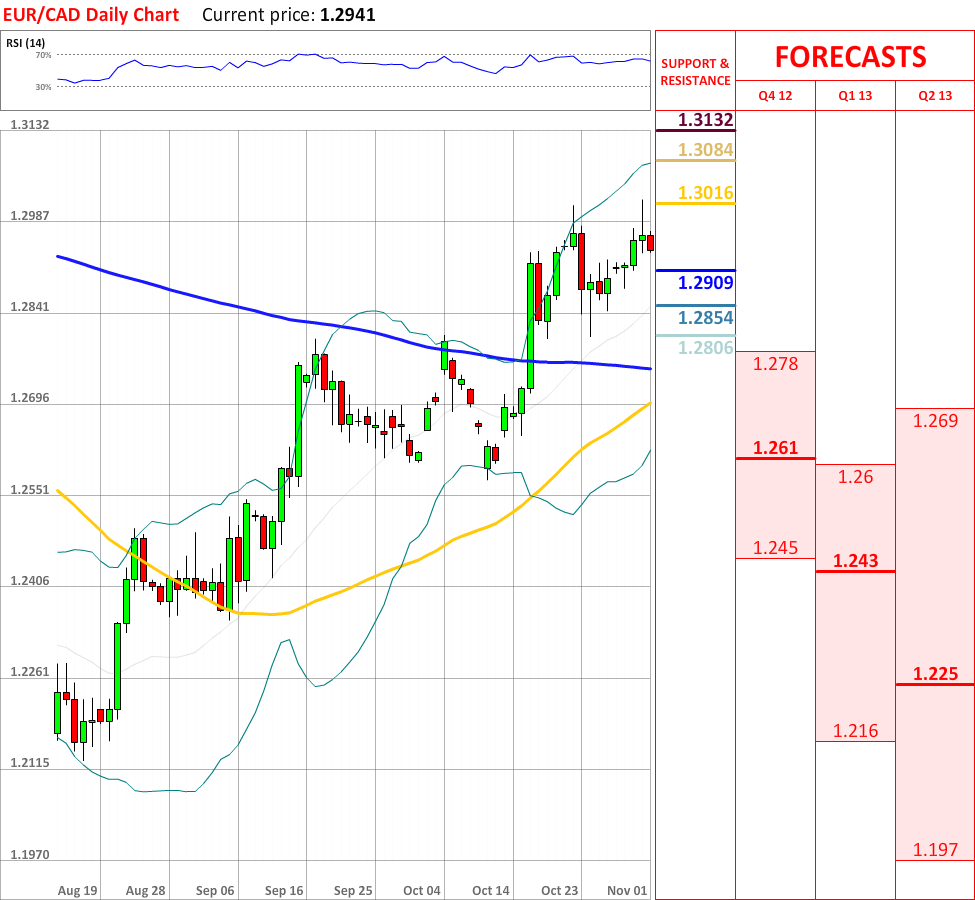 OutlookThe interim bullish trend, which started a couple of days ago, has failed to continue, as today the EUR/CAD currency pair experienced a slight bearish reaction, and at the particular moment the price is heading towards the monthly PP at 1.2909, which might bring some bullish impulse. However, if it fails to stop the downtrend, then the currency couple will probably reach the 20-day SMA at 1.2854, which in turn might reverse the direction of the prevailing movement downwards. In addition, the overall indicator outlook is bullish, therefore supporting the potential trend reversal in the nearest future.