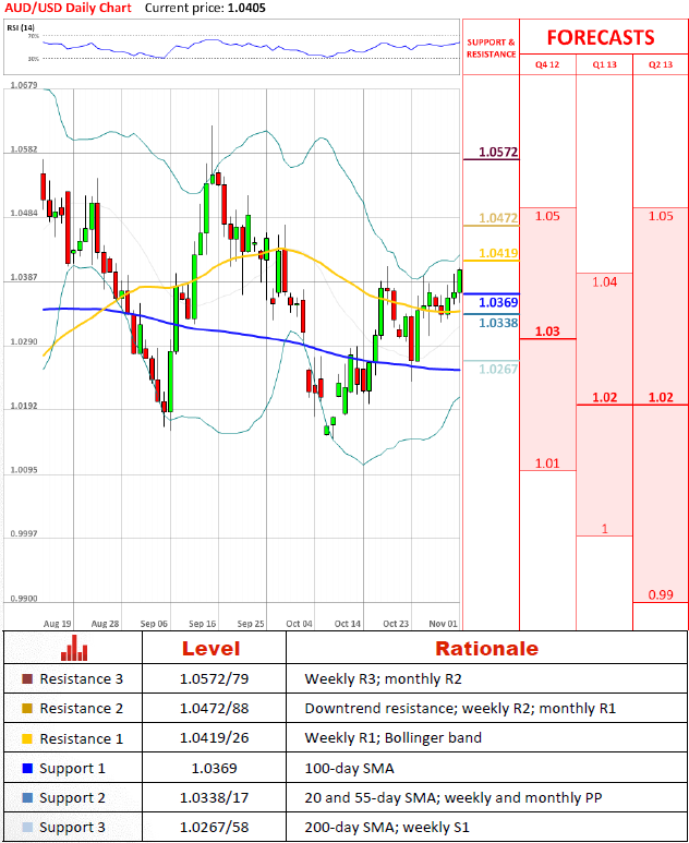 Presently the spot price is above the 100-day SMA, however, the rally is unlikely to be sustained as in the recent cases, given that formidable resistance levels lie overhead. AUD/USD could potentially climb over 1.0419/26, if we rely on daily technical indicators, but the pair should be capped by an area at 1.0472/88 and thus remain within a slightly downward sloping channel.