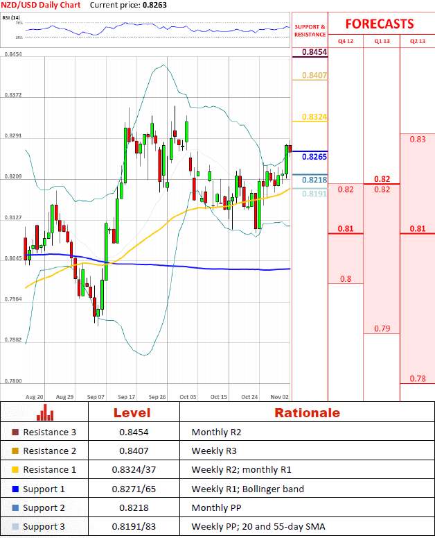 NZD/USD has successfully closed above 0.8271/65, meaning that the surge started on Oct 30 may be continued. However, the pair is behaving timidly, implying currently extant indecision in the market. Once the rally is recommenced, 0.8324/37 could fall the first victim to bulls, paving the way towards 0.8407. In the meantime, possible losses are expected to be limited by 0.8218 in conjunction with 0.8196/83.
