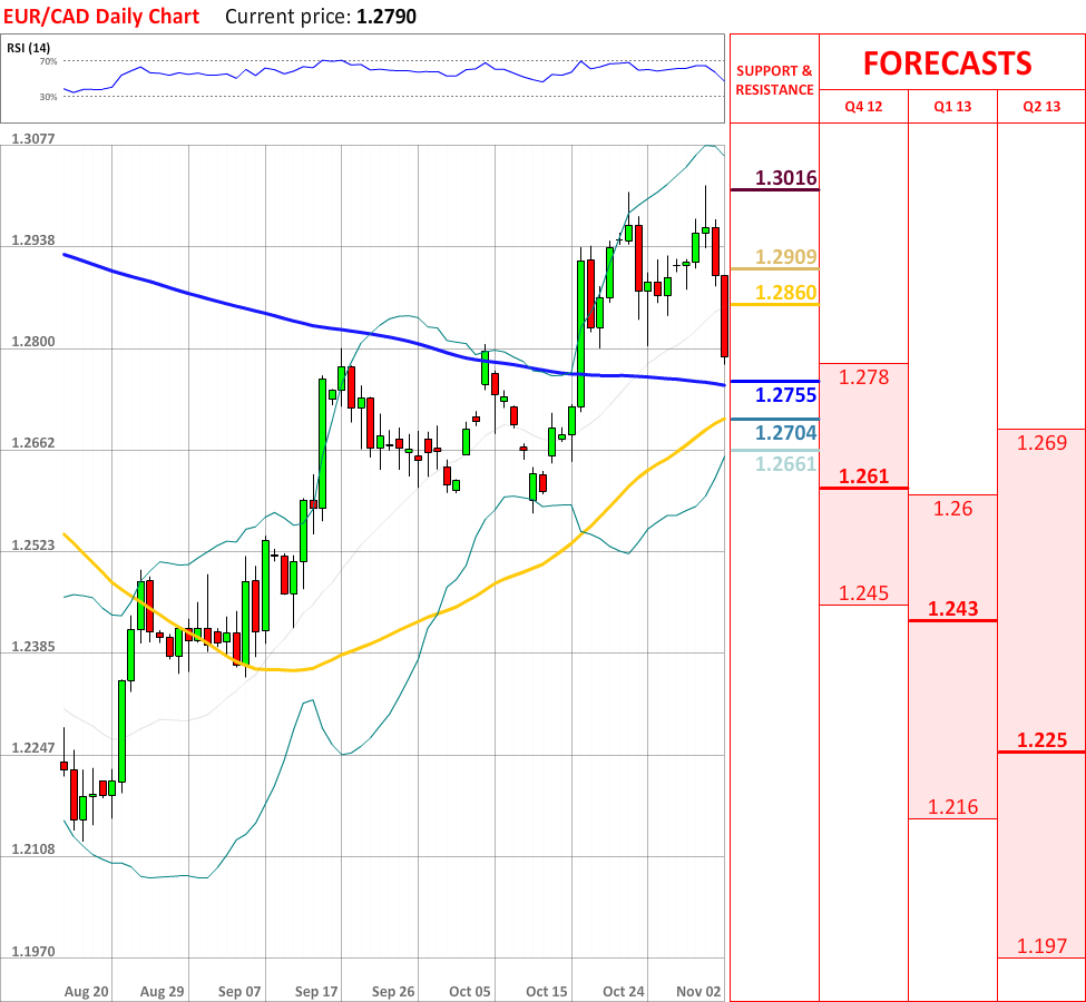 OutlookToday the EUR/CAD currency pair experienced a significant movement downwards, which has already managed to break the 20-day SMA at 1.2860, and now the currency pair is gradually approaching the 200-day SMA at 1.2755, which is very likely to stop the prevailing movement upwards. However, if it fails to slow down the current tendency, then the price might reach the 55-day SMA at 1.2704, which in turn is expected to bring some bullish impetus. Nevertheless, the overall indicator outlook has change to bullish, therefore supporting the potential tendency reversal in the nearest future.