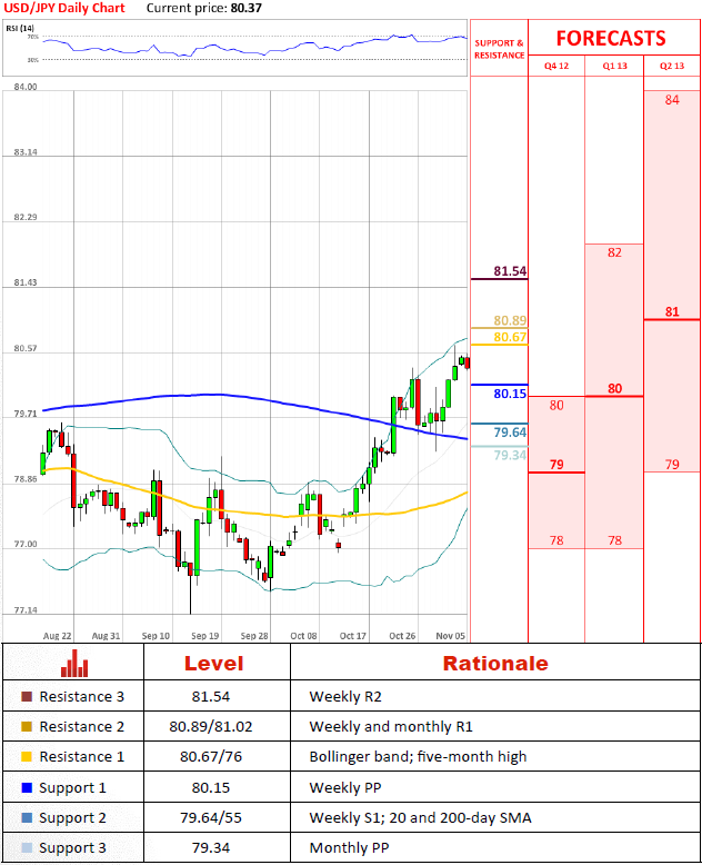 USD/JPY may yet again undergo a bearish correction before the recovery is recommenced. The price has just touched a five-month high and is expected to trim some of the recent gains. The pullback should not extend beyond 80.15, although we cannot rule out a possibility of a deeper retracement, resulting in a decline down to 79.64/55, where a previous correction was terminated.