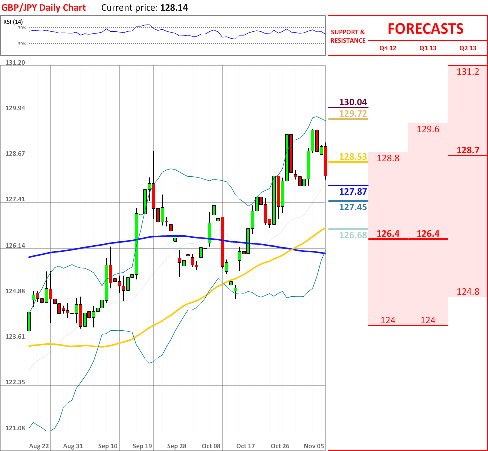 OutlookToday the GBP/JPY currency couple experienced a significant bearish reaction, which has already managed to overcome the weekly PP at 128.53, and at the particular moment the price is slowly moving towards the 20-day SMA at 127.87, which is very likely to stop the prevailing tendency. In case it fails to slow down the downtrend, then the currency pair might decline until the weekly S1 at 127.45, which in turn might reverse the current movement downwards. In addition, RSI indicator still shows a neutral signal, but the overall indicator outlook still remains bullish, therefore supporting the potential tendency change in the nearest future.