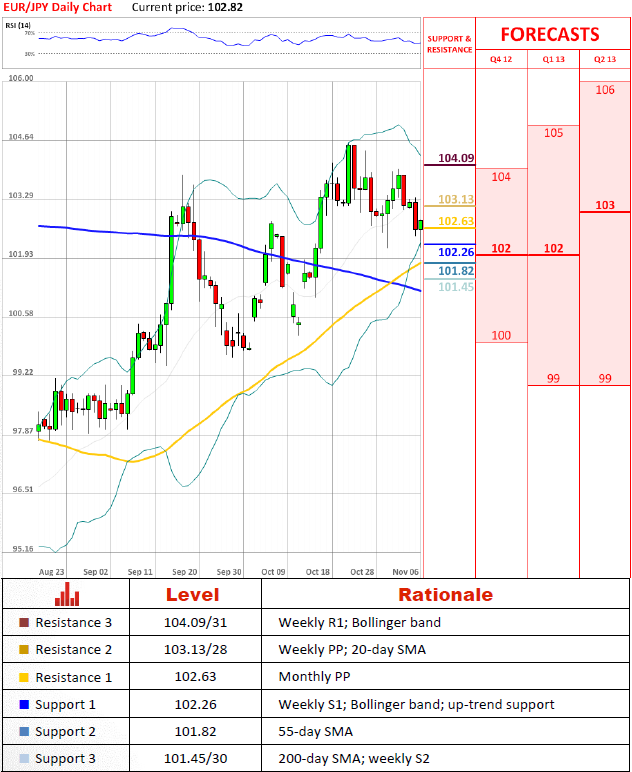 Today's price action is likely to draw a pin bar with a long lower shadow, which would imply strong buying pressure between 102.63 and 102.26, limiting possible losses of the Euro's value, at least in the short term. However, since the trading range of the pair is narrowing, a rising wedge is being formed on the chart, meaning an increased downside risk, as this is believed to be a reversal pattern.