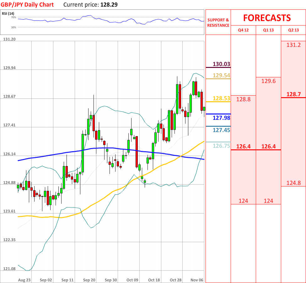 The significant movement downwards, which started yesterday, has failed to continue, as today GBP/JPY experienced a slight bullish correction, and at the particular moment the currency pair is slowly moving towards the weekly PP at 128.53, which might bring some bearish momentum. In case it is broken, then the currency couple is very likely to reach the upper Bollinger band at 129.54, which in turn will probably stop the prevailing rally. In addition, RSI indicator still shows a neutral signal, however, the overall indicator outlook has change to bullish, therefore supporting the current tendency.