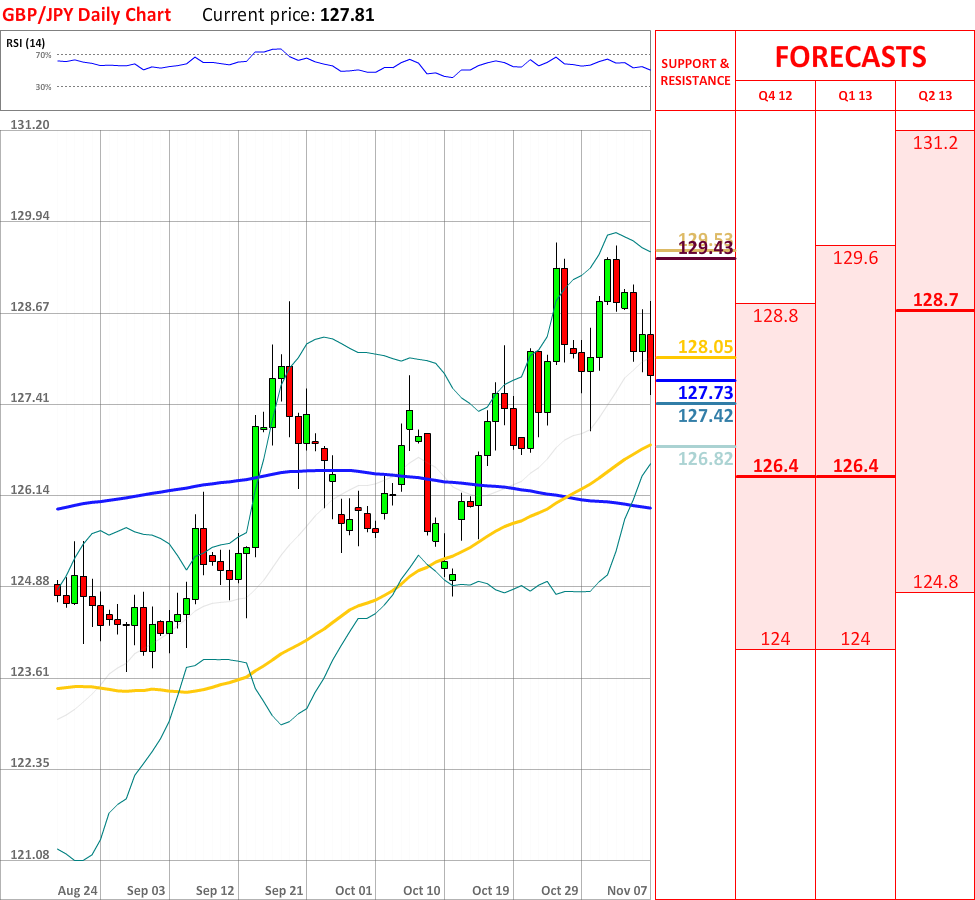 The bullish correction, which occurred yesterday, has failed to continue, as today GBP/JPY experienced a significant bearish movement, which has already managed to breach the 20-day SMA, and now the price is heading towards the monthly PP at 127.73, which might bring some bullish impetus. In case it fails to stop the downtrend, then the currency couple is likely to reach the weekly S1 at 127.42, which in turn will probably reverse the current tendency. In addition, the overall indicator outlook is bullish, therefore a soon trend reversal might be expected.