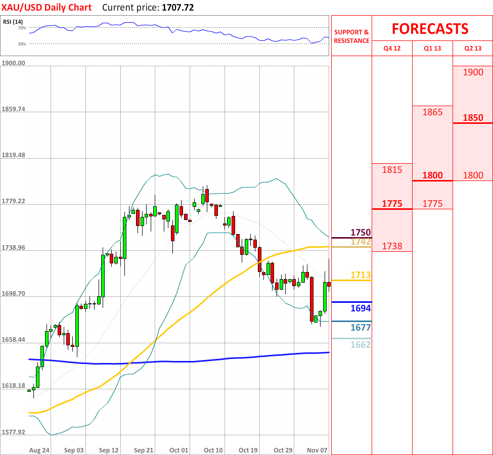 The interim bullish trend, which started a couple of days ago, has failed to continue, as today the XAU/USD exchange rate experienced a slight bearish reaction. As for now the price is slowly approaching the weekly PP at 1694, which is expected to bring some bullish impulse. In case it is breached, then the exchange rate is very likely to reach the lower Bollinger band at 1677, which in turn is expected to reverse the prevailing movement downwards. Additionally, the overall indicator outlook is negative, therefore supporting the current tendency.