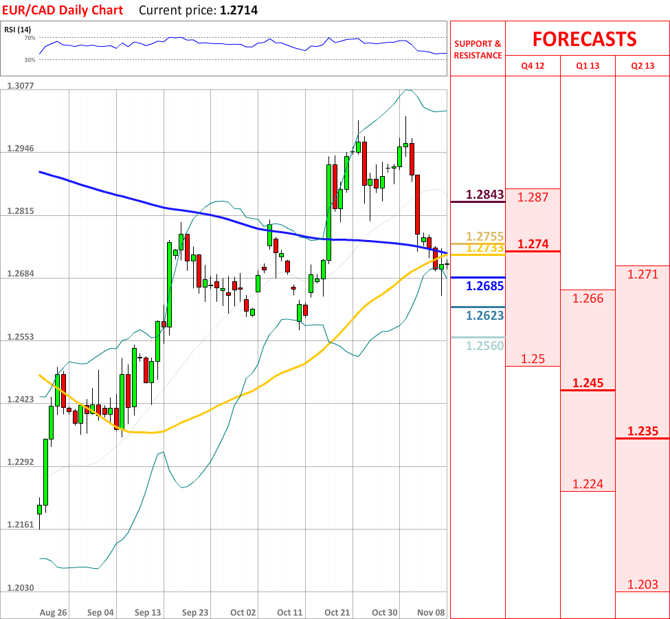 The bullish correction, which occurred yesterday, has failed to continue, as the EUR/CAD currency couple rebounded from the 55-day SMA at 1.2733, and at the particular moment the price is slowly heading towards the monthly S1 at 1.2685, which might slow down the downtrend. In case it is broken, then the currency pair is very likely to reach the lower Bollinger band at 1.2623, which in turn will probably change the direction of the current tendency. Nevertheless, the overall indicator outlook is neutral, therefore no significant trend reversals are expected in the nearest future.
