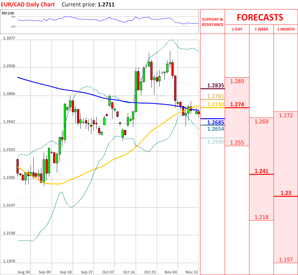 The uptrend, which started yesterday, has failed to continue, as today the EUR/CAD currency pair rebounded from the weekly PP, and now the price is slowly heading towards the monthly S1 at 1.2685, which will probably bring some bullish impulse. In case it fails to stop the downtrend, then the currency couple might decline until the weekly S1 at 1.2654, which in turn is very likely to slow down the current tendency. Nevertheless, the overall indicator outlook is neutral, therefore no significant trend reversals are expected in the nearest future.