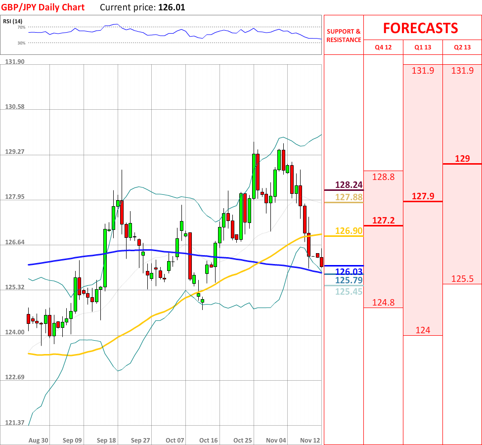 The interim downtrend, which started more than a week ago, has successfully managed to continue, as today GBP/JPY experienced another bearish decline, and at the particular moment the currency pair is about to test the 200-day SMA at 126.03, which is expected to stop the current downtrend, however, if it fails to slow down the bearish movement, then the currency couple will probably reach the lower Bollinger band, which in turn is very likely to change the direction of the current movement downwards. In addition, the overall indicator outlook is neutral, and it is expected to remain unchanged in the nearest future.