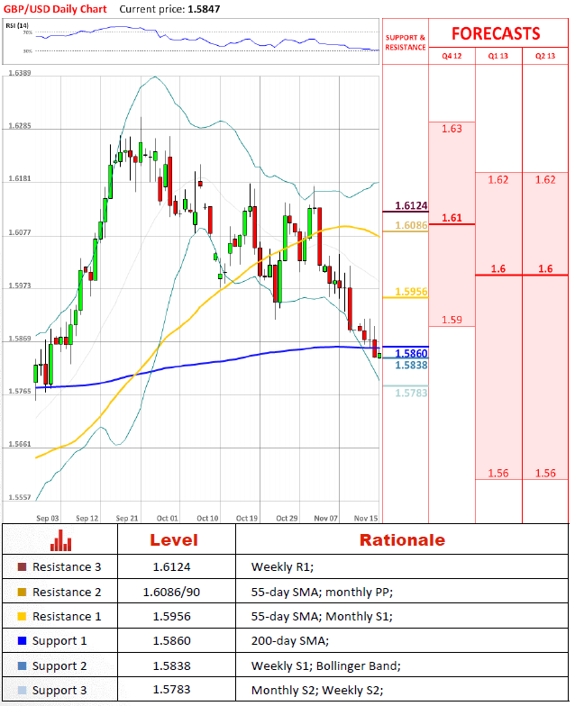 Yesterday GBP/USD pair finally breached the 200-day SMA at the 1.5859 level and stopped at 1.5838, where the weekly S1 goes. Currently, the price steps slightly higher than yesterday closing price, thus the moving average will be tested from the bottom, in order to continue the downtrend. However, a short position may contain a lot of risk, as the RSI has a value of 31 and the major currency counterparts show correction signs.