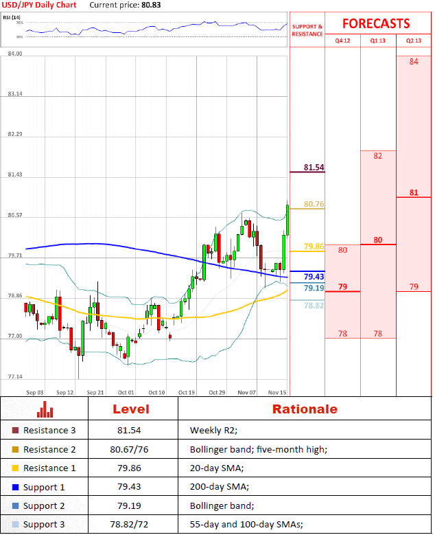 USD/JPY pair sharply increases for the second day. After the pair bounced from the 200-day SMA at 79.40, the price is surging and today made a new high at 80.95. However, currently USD/JPY is traded around the 80.80 level, where the upper Bollinger line goes. The price appreciation is possible, as indicators have not entered an oversold zone yet, but if increase loses its momentum, the divergence might appear with a risk for decrease.
