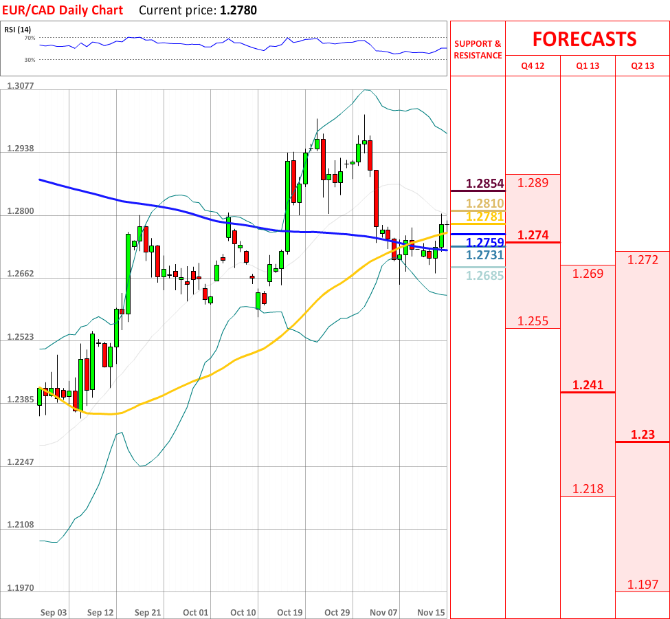 The interim uptrend, which started a couple of days ago, has failed to advance further, as today EUR/CAD experienced a slight bearish reaction. At the particular moment the price is heading towards the 55-day SMA at 1.2759, which will probably bring some bullish impulse, but if it is broken, then the currency pair might reach the 200-day SMA at 1.2731, which in turn is expected to stop the prevailing downtrend. In addition, the overall indicator outlook is negative, therefore supporting the current tendency.