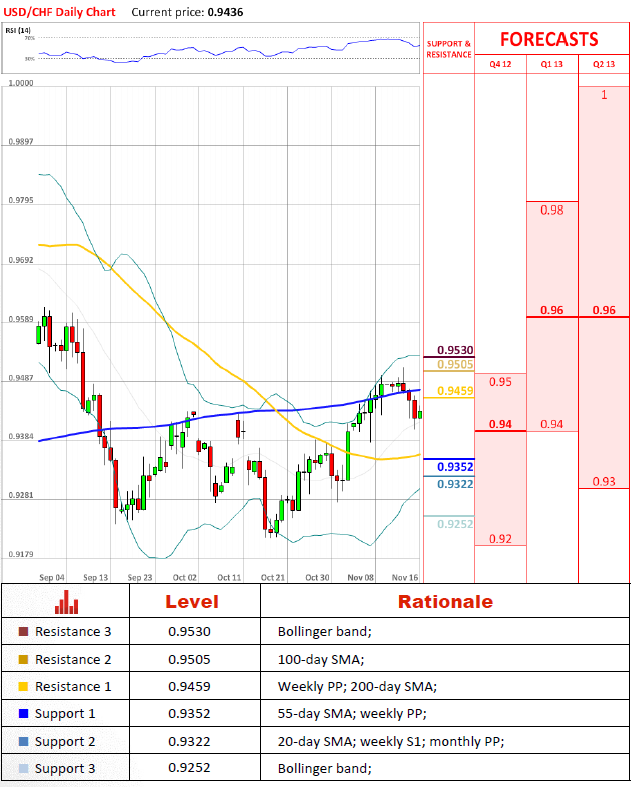 - Technical Strategist at Bank of America Merill Lynch (based on Bloomberg)Pair's OutlookYesterday USD/CHF pair settled beneath the 200-day SMA and slipped even lower, touching the weekly S1 and the 20-day SMA, which indicates the middle of Bollinger bands range. Currently, the price steps higher and holds a great likelihood to retest the 200-day SMA at 0.9462 in a daily graph scale, but as it has already broken a short period up-trend and passed the moving average, the pair turned into a bearish trend.