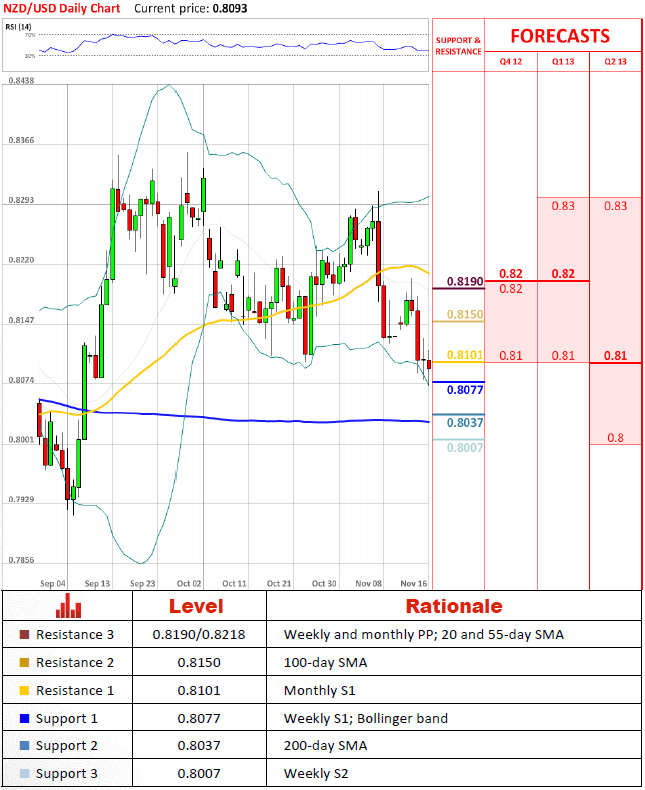 Pair tried to claw back some of its losses, but it seems we are rather likely to see a dip to 200-day SMA average in the near future instead. Main reason for this could be a bearish impetus pair received from 20-bar SMA at 13th of November. If Bollinger band won't manage to provide significant support for the pair we can be certain to see a major dip to 0.8037.