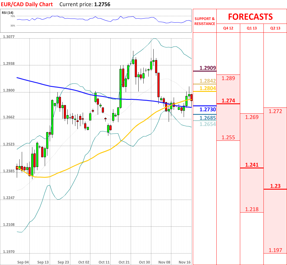 OutlookToday the EUR/CAD currency pair experienced a slight bearish movement, which has already managed to breach the 55-day SMA, and now the currency couple is about to test the 200-day SMA at 1.2730, which is expected to reverse the prevailing movement downwards. In case it broken, then the price is very likely to reach the monthly S1 at 1.2685, which in turn will probably bring some bullish impetus. Nevertheless, RSI indicator shows a neutral signal, although the overall indicator outlook remains negative.