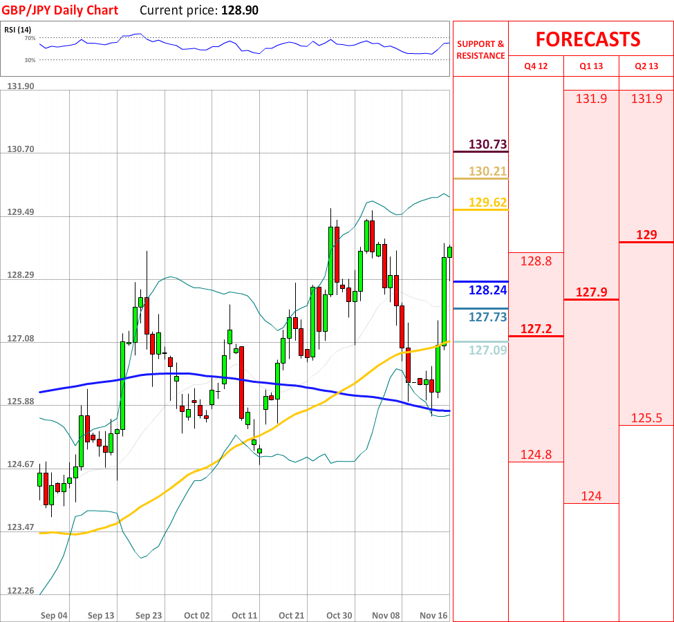 OutlookThe interim uptrend, which started a couple of days ago, has successfully managed to continue, as today GBP/JPY experienced another consequent bullish correction, and at the particular moment the price is slowly approaching the upper Bollinger band at 129.62, which is very likely to change the direction of the prevailing tendency, however, if it fails to slow down the rally, then the currency couple might reach the weekly R2 at 130.21, which in turn might bring some bearish momentum. In addition, the overall indicator outlook is neutral, therefore no significant trend reversals are expected in the nearest future.