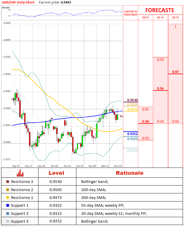 - Societe Generale SA (based on Bloomberg)Pair's OutlookDuring Friday trading session USD/CHF pair moved up and checked the 200-day SMA at 0.9466. Seems that the check test was successful, as the price closed beneath the moving average and today extends a downside movement. The possible support levels are 0.9393, the weekly S1, and the 0.9362-0.9344 range, where the 55-day SMA and the weekly S2 cross.