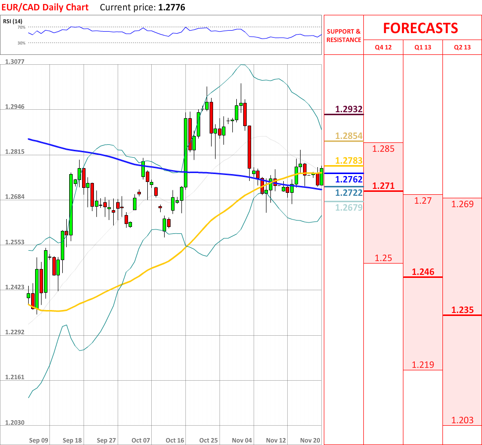 OutlookThe bearish reaction, which occurred yesterday, has failed to continue, as today EUR/CAD experienced a significant movement upwards, which has already managed to break the 55-day SMA. As for now, the currency couple is about to test the 20-day SMA at 1.2783, which might slow down the rally, but if it is broken, then the currency pair is likely to reach the monthly PP at 1.2854, which in turn will probably bring some bearish impetus. Additionally, the overall indicator outlook is negative, therefore a soon trend reversal might me expected.