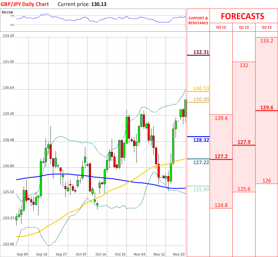 OutlookThe bearish reaction, which occurred yesterday, has failed to continue today, and today the GBP/JPY currency couple experienced a bullish advance, which has already managed to overcome the weekly R1, and ate the particular moment the currency pair is heading towards the upper Bollinger band at 130.53, which is expected to change the direction of the prevailing tendency, however, if it fails to slow down the movement upwards, then the price will probably reach the weekly R2 at 132.31, which in turn is very likely to stop the uptrend. Moreover, the overall indicator outlook is neutral, therefore no significant trend reversals are expected in the nearest future.