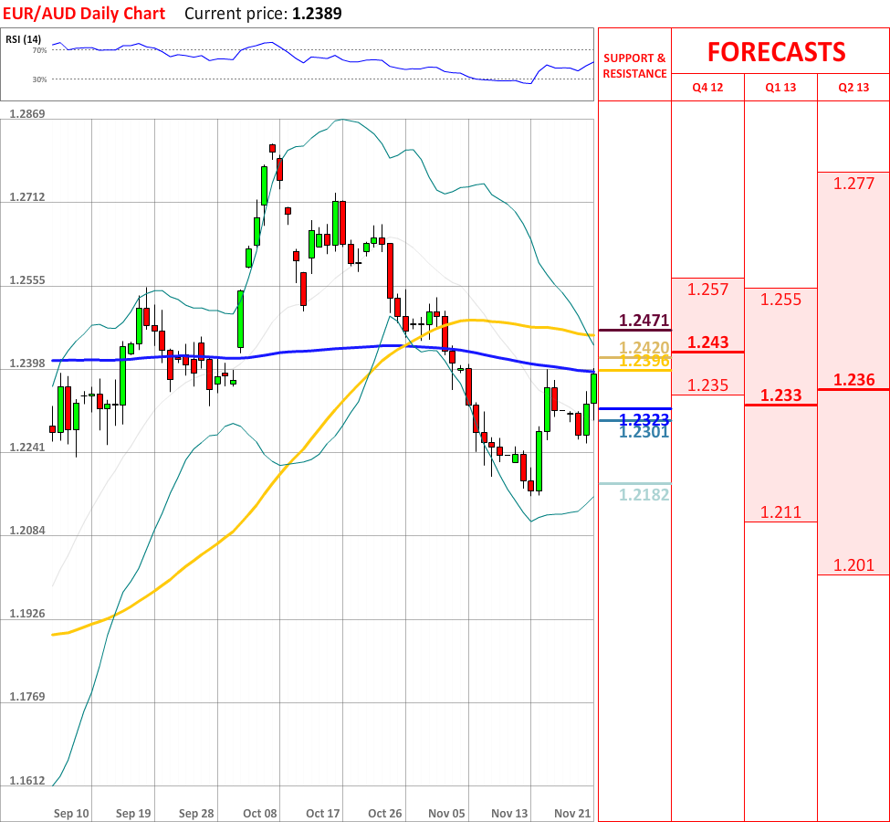 OutlookThe uptrend, which started yesterday, has successfully managed to continue, and today the EUR/AUD currency couple experienced another movement upwards. As for now, the price is about to test the 200-day SMA at 1.2396, which is expected to change the direction of the prevailing tendency. In case it is broken, then the currency pair might reach the weekly R1 at 1.2420, which in turn might bring some bearish momentum. Moreover, the overall indicator outlook is bearish, therefore supporting the potential trend reversal.