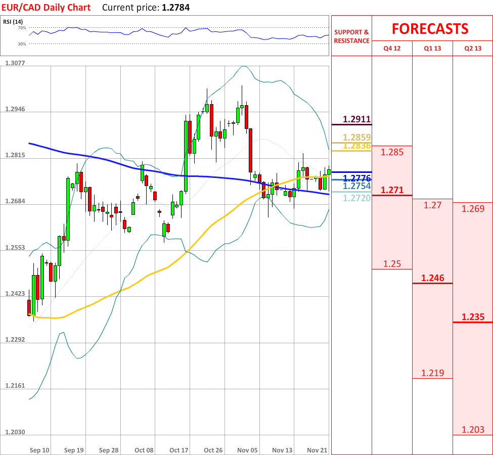 OutlookToday the EUR/CAD currency pair experienced another bullish movement, which has already managed to break the 20-day SMA at 1.2776, and at the particular moment the price is slowly approaching the weekly R1 at 1.2836, which might slow down the rally, however, if it is breached, then the currency couple is likely to reach the monthly PP at 1.2859, which in turn will probably stop the current movement upwards. Nevertheless, the overall indicator outlook is negative, therefore a soon tendency change might be expected.