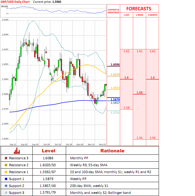 GBP/USD pair showed a strong upside impetus yesterday, as the price reversed from a 1.5879 level and without any corrections reached a 1.5965 level, where the first resistance area ends. Currently, the pair is traded around a 1.5959 level and is close to another resistance zone at 1.5880-1.6010, where historical movements formed a flat zone, which is very likely to cause problems to an upward movement and will not allow penetration of this level easily.