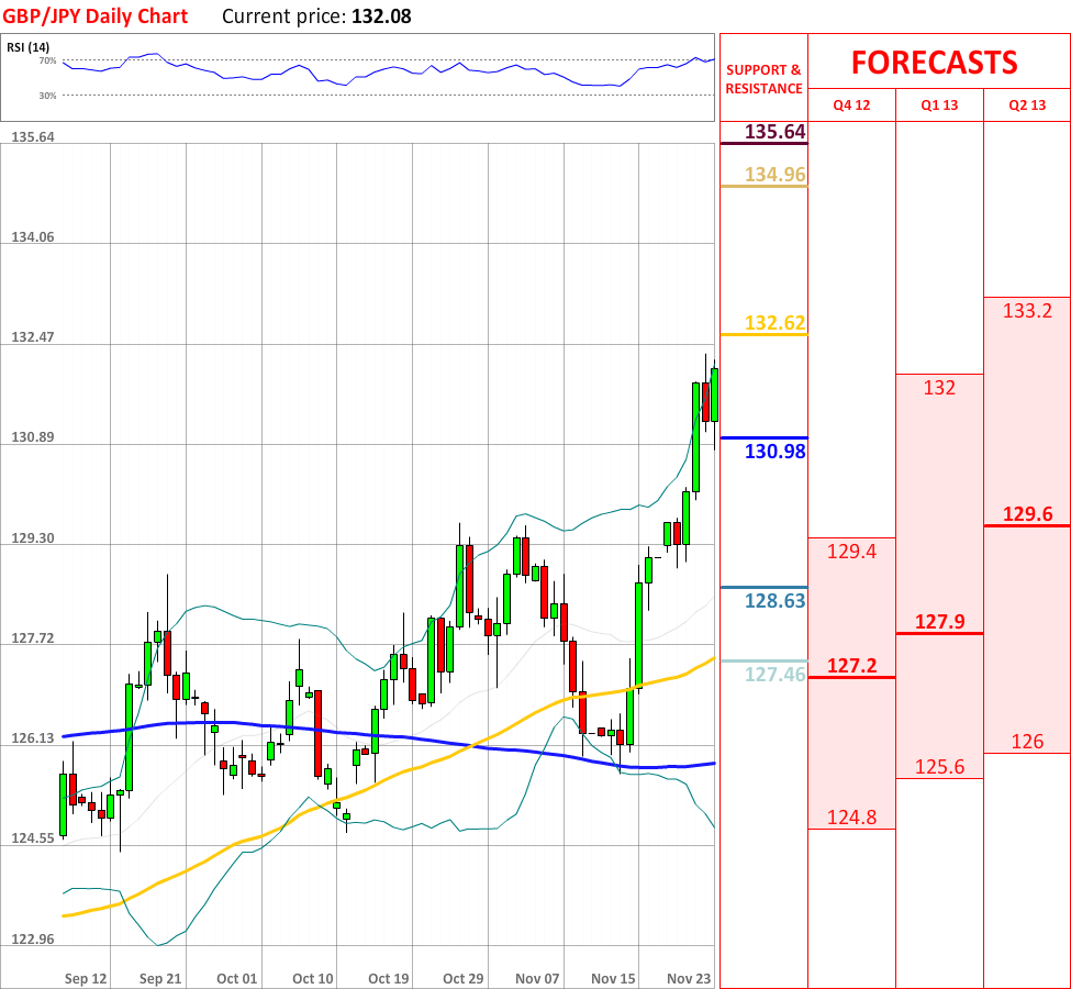 OutlookThe bearish reaction, which occurred yesterday, has failed to continue, as today GBP/JPY experienced a bullish correction, and at the particular moment the currency pair is about to test the upper Bollinger band at 132.62, which is expected to change the direction of the current tendency, however, if it is broken, the the price might advance until the weekly R3 at 134.96, which in turn is likely to bring some bearish impetus. In addition, the overall indicator outlook remains neutral, and it is not expected to change in the nearest future.