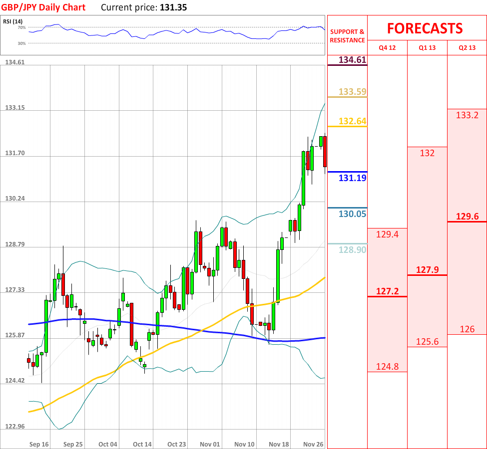 OutlookToday GBP/JPY experienced a significant bearish reaction, which has already broken the weekly R1, and at the particular moment the currency pair is about to test the weekly PP at 131.19, which will probably bring some bullish impulse, but if it is breached, then the currency couple is likely to reach the weekly S1 at 130.05, which in turn might stop the prevailing downtrend. In addition, the overall indicator outlook is neutral, and it is not expected to change in the nearest future.