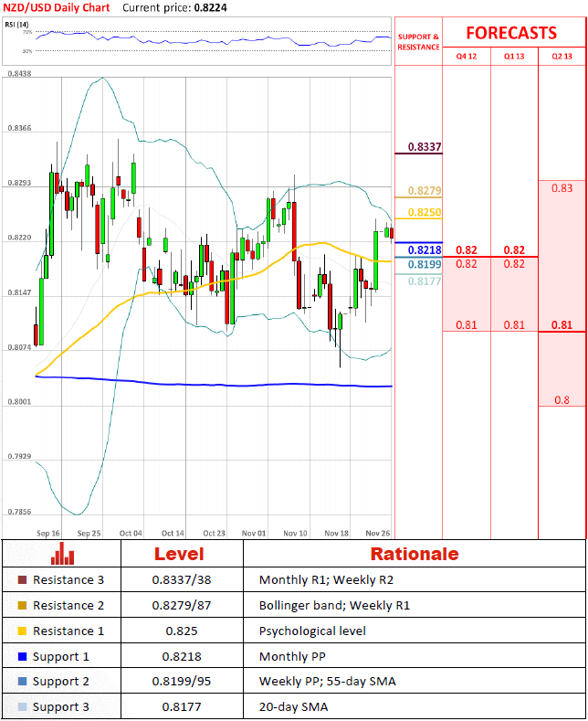 For tried trading session pair tried to step up higher but did not manage to breach 0.825 and at the moment is supported only bu monthly pivot (PP0 at 0.8218. Technical indicators suggest that this dip should persist some time more, but it should take some time for the pair to breach a cluster of support levels at 0.82. A possible bounce from this level cannot be forgotten as well.
