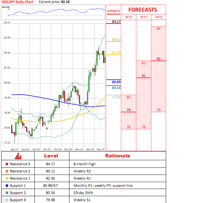 USD/JPY currency pair gradually swings lower in a H1 timeframe Bollinger bands range and permanently makes new lows, what indicates about an upside momentum weakening. If current action is correction, there is very high possibility that the price will reach 38% Fibo level at 81.39 from the last upside wave, which also crosses with an upper line of a historical flat.